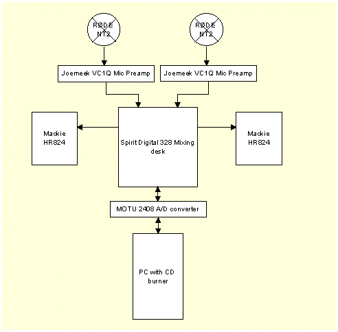 Analogue to digital conversion was performed at 24 bit, 44.1K using channels of the Spirit 328 console. The digital signal was taken via a MOTU 2408 direct to hard disk under the control of Steinberg Wavelab 3.